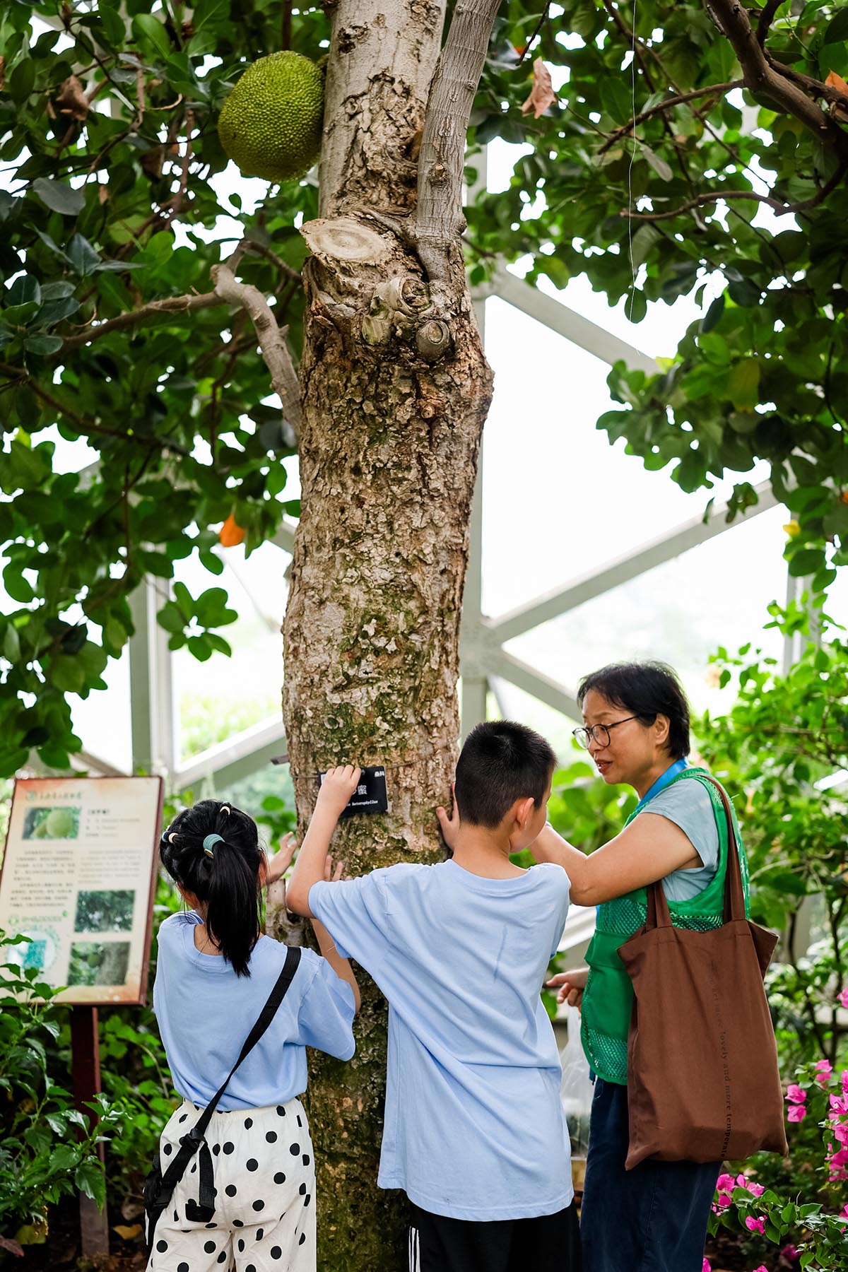户外环节中,邀请了辰山植物园6位优秀的科普志愿者带领视障家庭来到辰山的盲人植物园和展览温室参观。辰山植物园在设计之初就有前瞻性地开辟了为视障人群设置的盲人植物园。盲人植物园的主题是“一米阳光”,园内设有盲文、盲道,种植了芳香植物、各种不同树皮的植物、树叶差异化比较大的植物类群。科普志愿者们以结对子的形式,每人带领2—3位视障小朋友开展实地讲解,从第一天的展览温室到第二天的盲人植物园,孩子们沉浸式体验到各种植物的趣味科普知识。为了让小朋友能更加深入地了解植物的不同特征,科普志愿者们也是早早就来到园内,进行了前期实地踩点和培训。