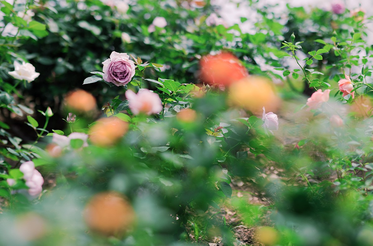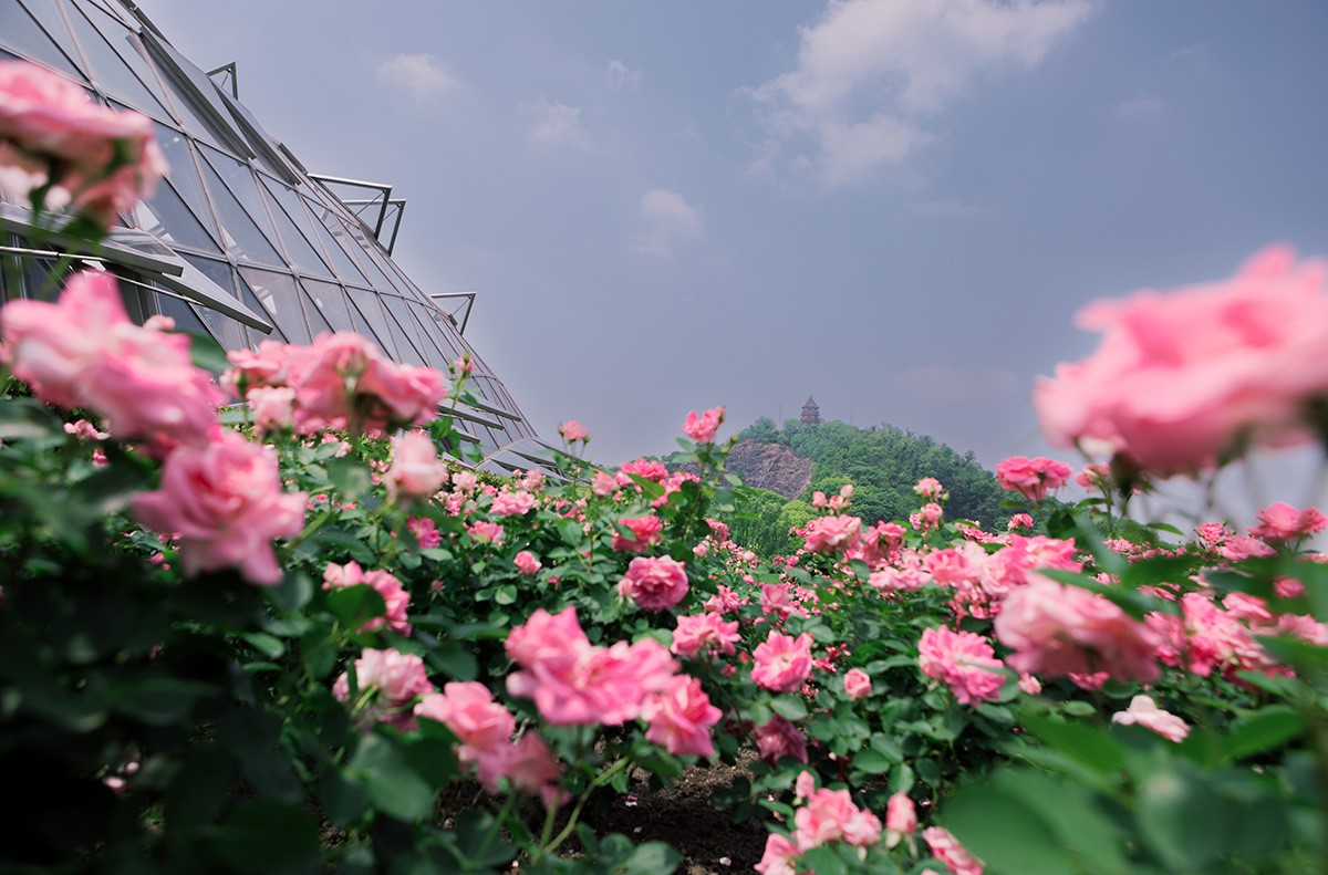 以2.6公顷延绵的流畅花带沿地形起伏铺展。深浅不一的月季随坡势流淌,如烟如雾,宛若空中倾泻的月季河流, [冰山]月季、[仙境]月季等数百品种错落交织,连绵交叠成澎湃的花浪。浩瀚花海与天际线相融,翻涌的花潮裹挟暗香,植株间的疏密韵律仿若被自然谱写成诗,展呈群体的壮阔画卷。