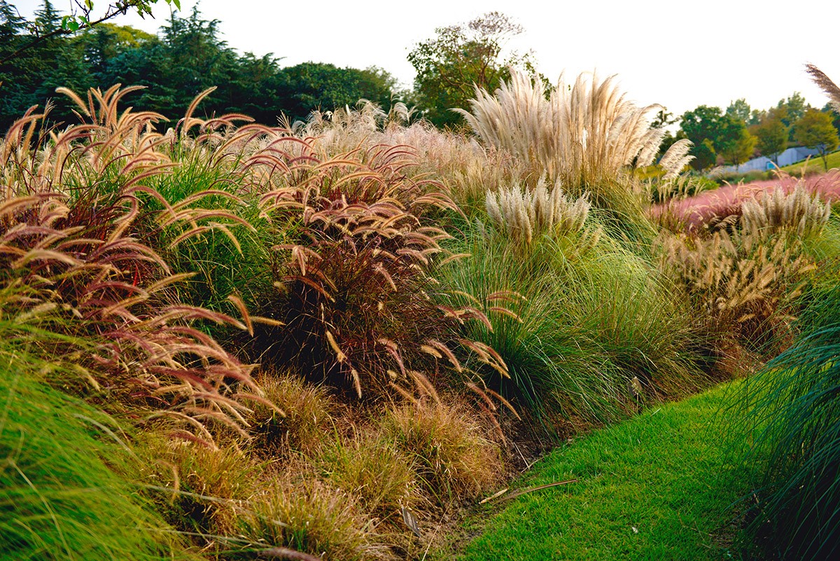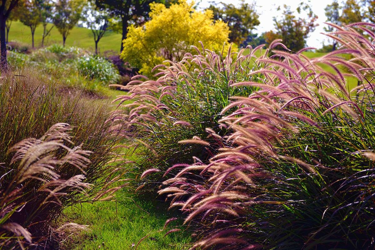 目前,蒲苇、矮蒲苇、‘金红羽’狼尾草、‘紫叶’狼尾草、‘火焰’狼尾草、羽绒狼尾草、‘谢楠多’柳枝稷、粉黛乱子草、斑茅、歌舞芒、花叶芒、细叶芒、晨光芒、花叶芦竹、小盼草等百余个观赏草品种竞相绽放,它们有的叶片随风灵动飘逸,有的花序跃然于株丛之上、有的犹如喷泉般向四周散开、有的如云霞般朦胧梦幻,还有的悬垂于茎杆顶端……为整个秋季增添了无限的魅力。同时,还有‘珠峰’薹草、金叶薹草、棕红薹草、‘金色发丝’大岛薹草等十余个色叶类的薹草品种正值观叶期,微风拂过,草叶散发出清新的香气,清人心脾,仿佛在人与大自然之间建立起了一道无形的纽带。