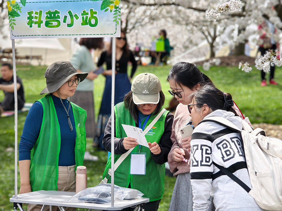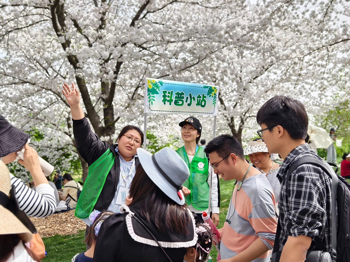 活动二:科普小站樱花定点科普讲解。樱花科普定点讲解作为一种创新的自然教育形式,不仅丰富了游客的赏樱体验,更在知识传播、文化传承、生态保护等多个维度发挥了重要作用。游客在赏樱花的同时,不需要花费很多时间,在樱花大道边上就能通过科普志愿者的讲解,对樱花背后有趣的故事就能略知一二,还能和科普志愿者进行有效的互动问答,以此来加深对樱花的印象。樱花定点科普讲解将于3月15日(周六)、3月16日(周日)开展(如遇雨天则停止),届时游客在樱花树下,看到身穿绿马甲的科普志愿者,就能上前互动体验。